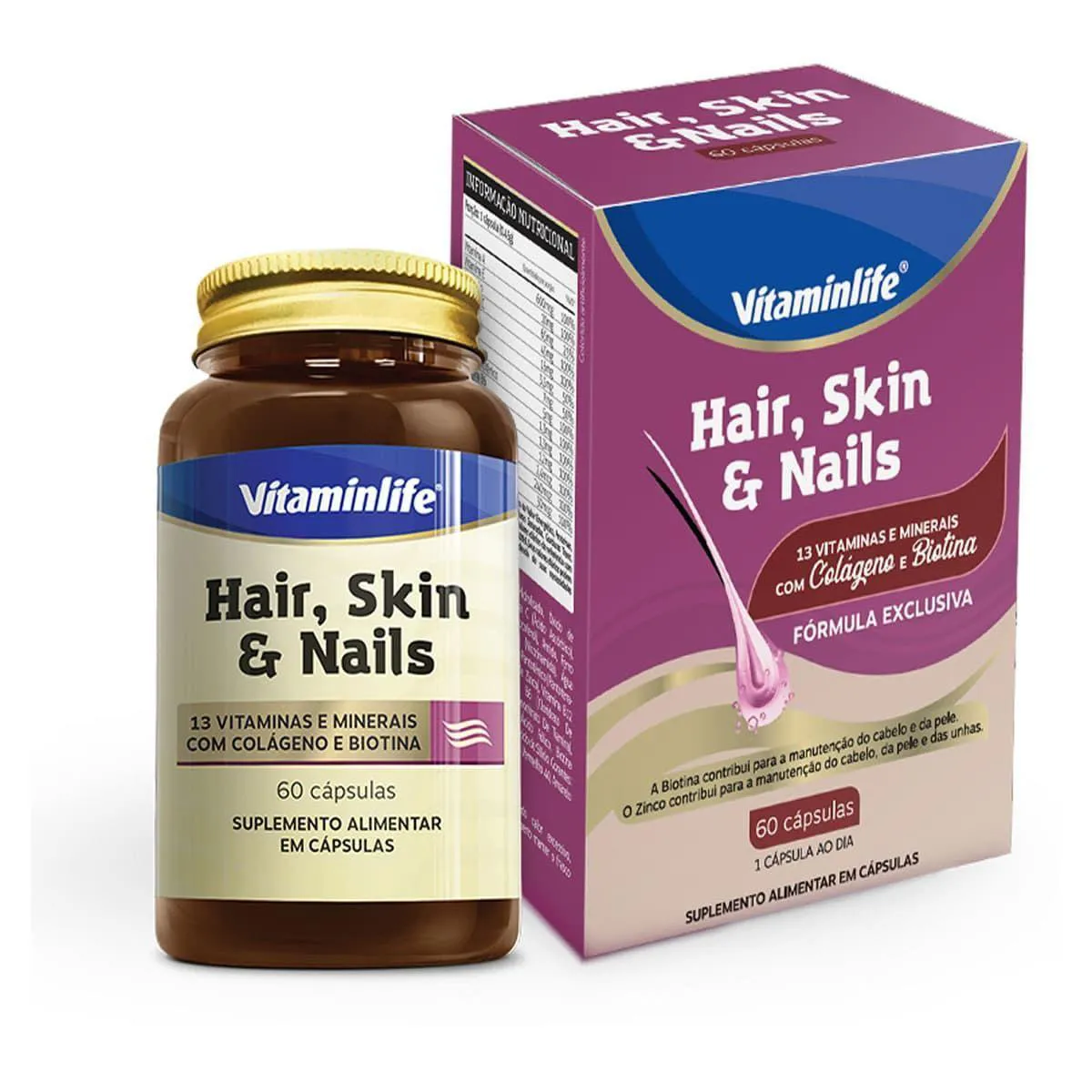 Em até 1x de R$161,46 sem jurosEm até 12x de R$15,27 com juros À vistaR$145,31no Pix Hair, Skin e Nails Com Colágeno e Biotina – 60 Cápsulas – Vitaminlife